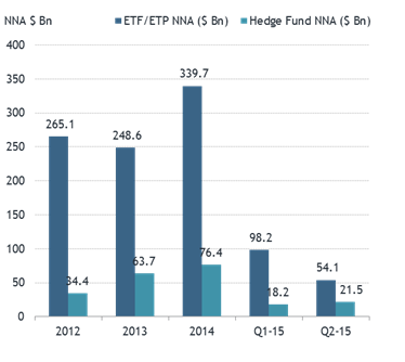 Accordingly, net inflows into ETFs/ETPs have been significantly higher than net inflows into hedge funds over the past few years. In the first half of 2015, net inflows into hedge funds globally were US$39.7 billion, while net inflows into ETFs/ETPs globally were US$152.3 billion over the same period.