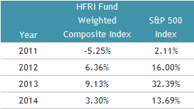 Annual returns of the HFRI Fund Weighted Composite Index and the S&P 500 Index