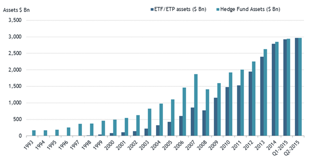 Assets in the global ETF/ETP industry surpassed assets in global hedge funds at the end of Q2 2015