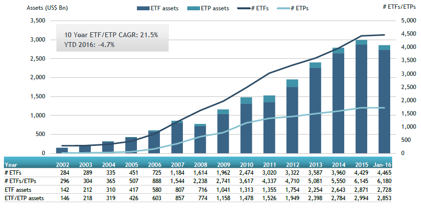At the end of January 2016, the global ETF/ETP industry had 6,180 ETFs/ETPs, with 11,895 listings, assets of US$2,853 Bn, from 277 providers on 64 exchanges. In January 2016, 43 new ETFs/ETPs were launched by 17 different providers.