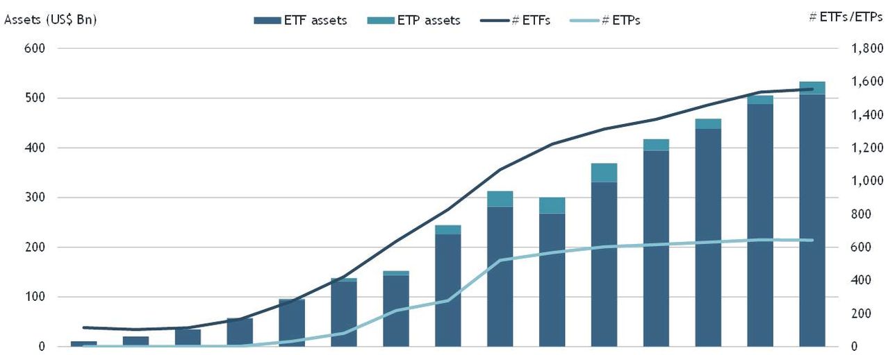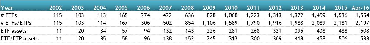 At the end of April 2016, the European ETF/ETP industry had 2,197 ETFs/ETPs, with 6,910 listings, assets of US$533.4 Bn, from 52 providers listed on 25 exchanges in 21 countries.