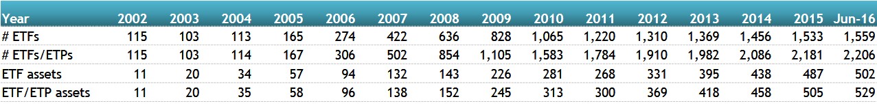 At the end of June 2016, the European ETF/ETP industry had 2,206 ETFs/ETPs, with 6,920 listings, assets of US$529 Bn, from 53 providers listed on 25 exchanges in 21 countries.