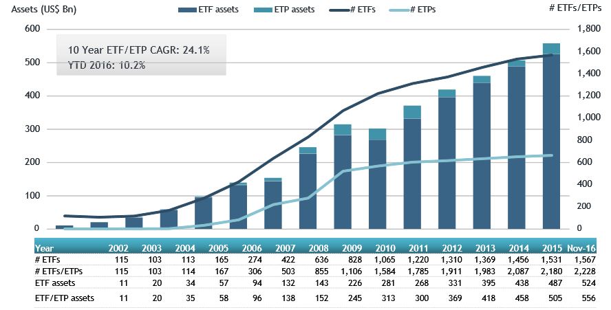 At the end of November 2016, the European ETF/ETP industry had 2,228 ETFs/ETPs, with 7,023 listings, assets of US$556 Bn, from 56 providers listed on 25 exchanges in 21 countries.