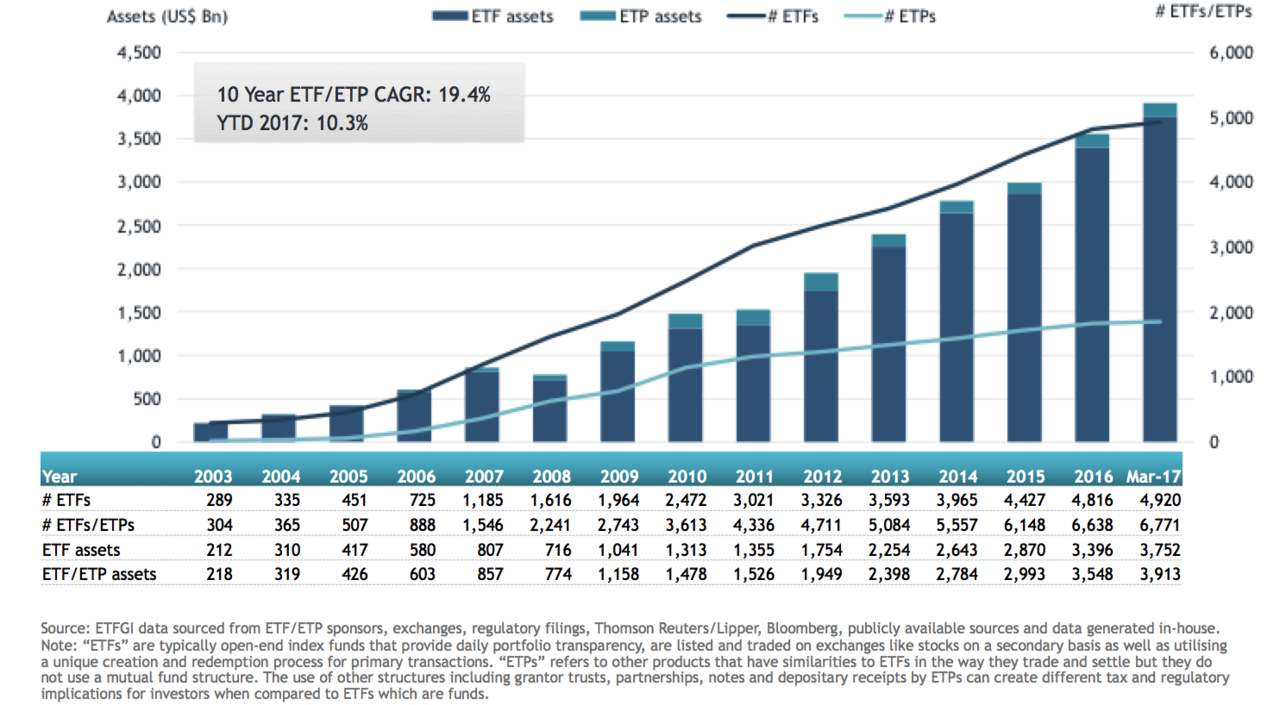 ETFs/ETPs listed globally gathered record inflows of US$66 billion and assets reached a new high of US$3.913 trillion at the end of Q1 2017