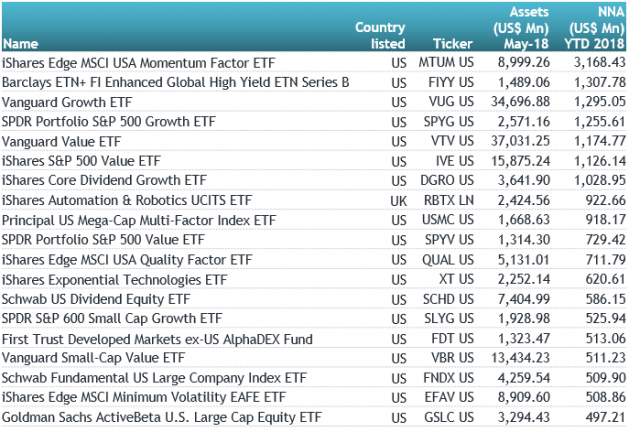 Growth smart beta products gathered the largest net inflows during May 2018 with $1.67 Bn, followed by value factor products with $1.29 Bn, and Momentum-based products with $1.18 Bn.