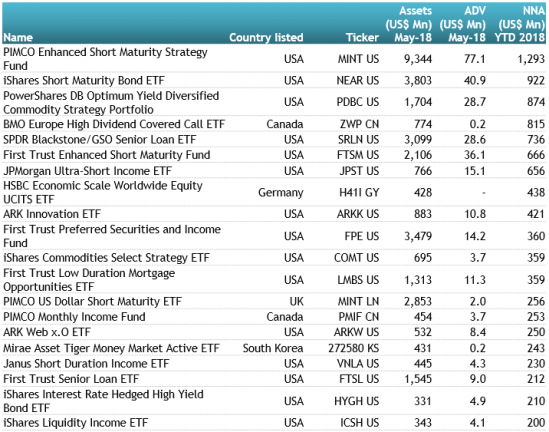 Investors have tended to invest in active fixed income ETFs in May 2018 with PIMCO US Dollar Short Maturity ETF (MINT US) and iShares Short Maturity Bond ETF (NEAR CN) capturing most of the flows.