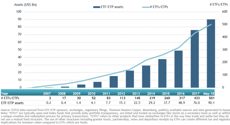 At the end of May 2018, the Global active ETF/ETP industry had 501 ETFs/ETPs, with 607 listings, assets of $90.1 Bn, from 103 providers on 18 exchanges in 15 countries.