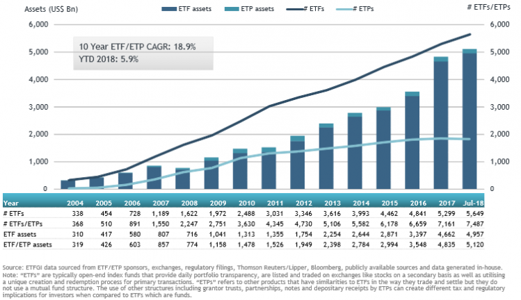 ETFGI reports assets invested in ETFs and ETPs listed globally reached a new high of $5.12 trillion at the end of July 2018